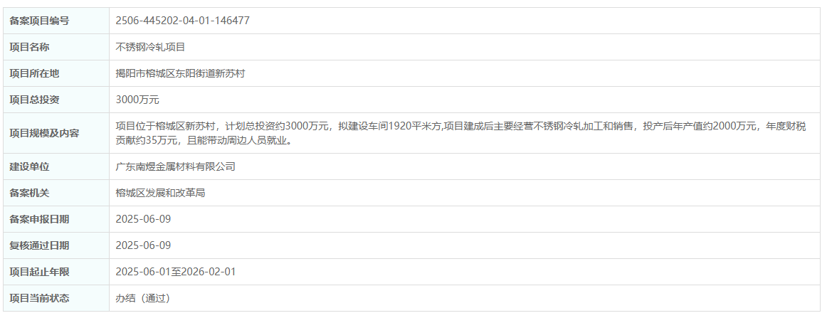 2025年6月9日,揭阳市榕城区东阳街道新苏村不锈钢冷轧项目备案复核获通过。